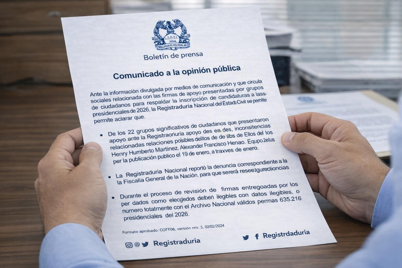 A través del Boletín 23, fechado el 11 de febrero de 2026, la entidad electoral precisó que, de los 22 grupos significativos que entregaron apoyos para respaldar candidaturas, únicamente los comités de Henry Humberto Martínez y Alexander Francisco Henao registraron inconsistencias asociadas a posibles fraudes o conductas delictivas. En esos dos casos, la Registraduría informó que presentó denuncia ante la Fiscalía General de la Nación para que adelante las investigaciones correspondientes.