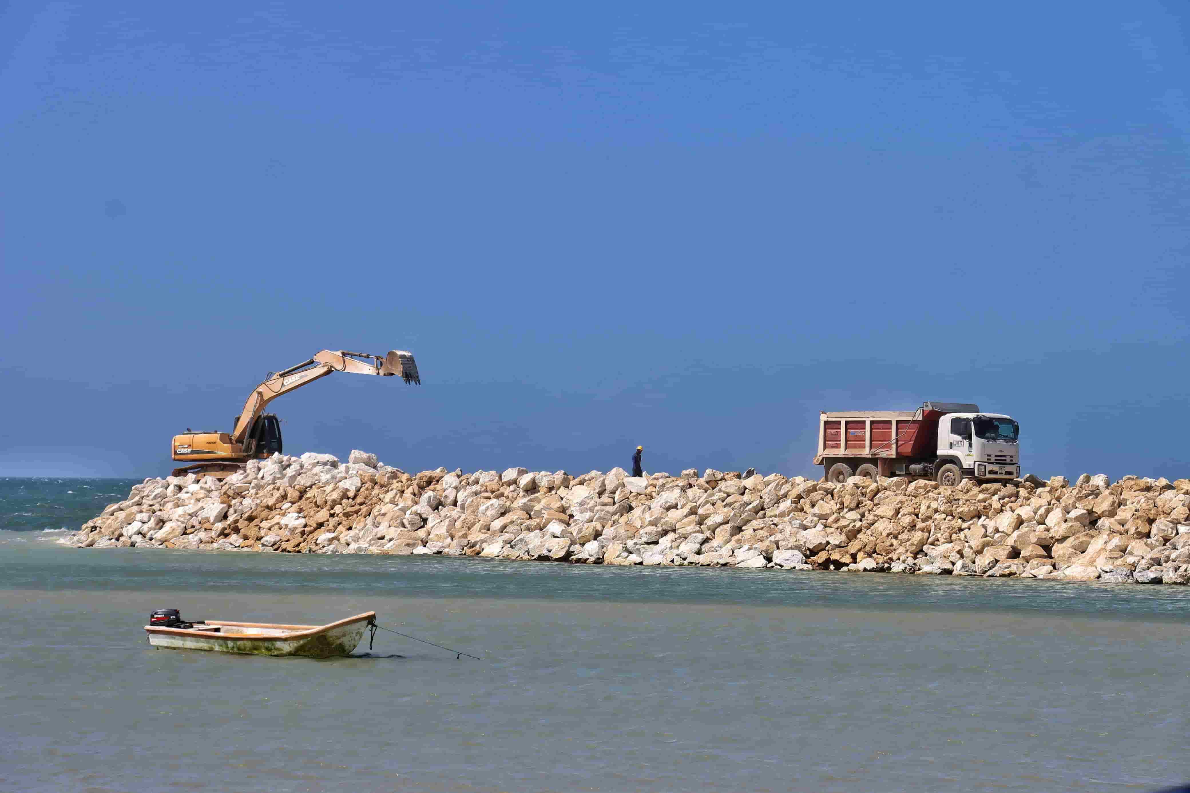 Los trabajos incluyen la instalación de estructuras de protección marina y la redistribución controlada de sedimentos para fortalecer la línea de costa y reducir el impacto del oleaje sobre viviendas, comercios e infraestructura turística.