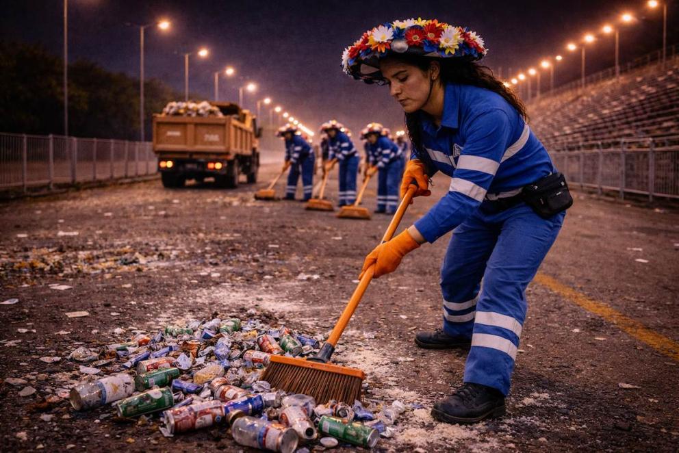 Cuando la música se apaga, la Vía 40 no queda en silencio: entra otro desfile. El de las escobitas que sostienen el Carnaval mientras una de ellas ensaya, entre escobas, una canción de amor que aún no se atreve a decir.