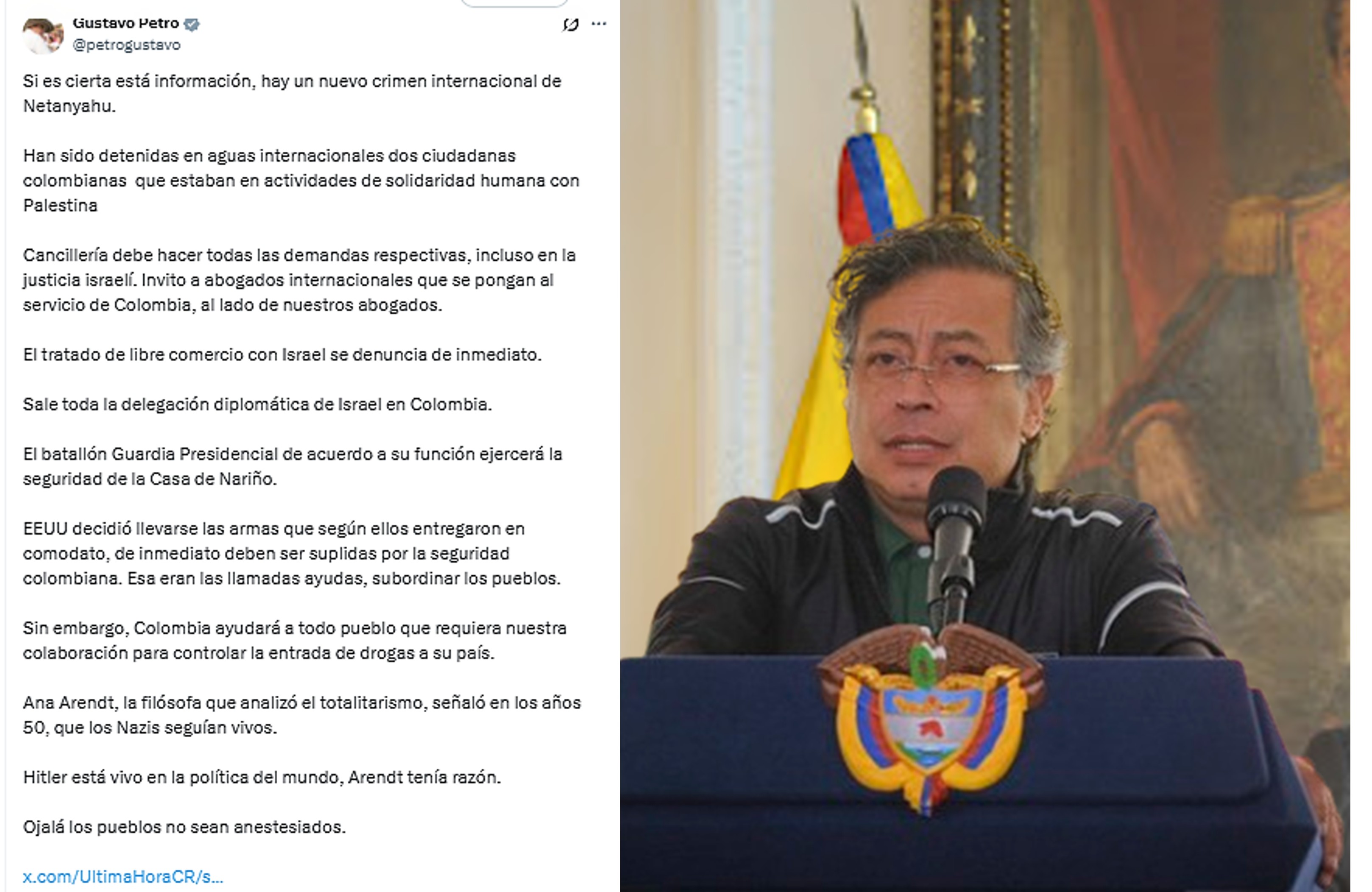 Colombia – El presidente Gustavo Petro anunció este miércoles la expulsión de toda la delegación diplomática de Israel en Colombia, tras la detención en aguas internacionales de dos ciudadanas colombianas que participaban en una misión humanitaria con Palestina.
