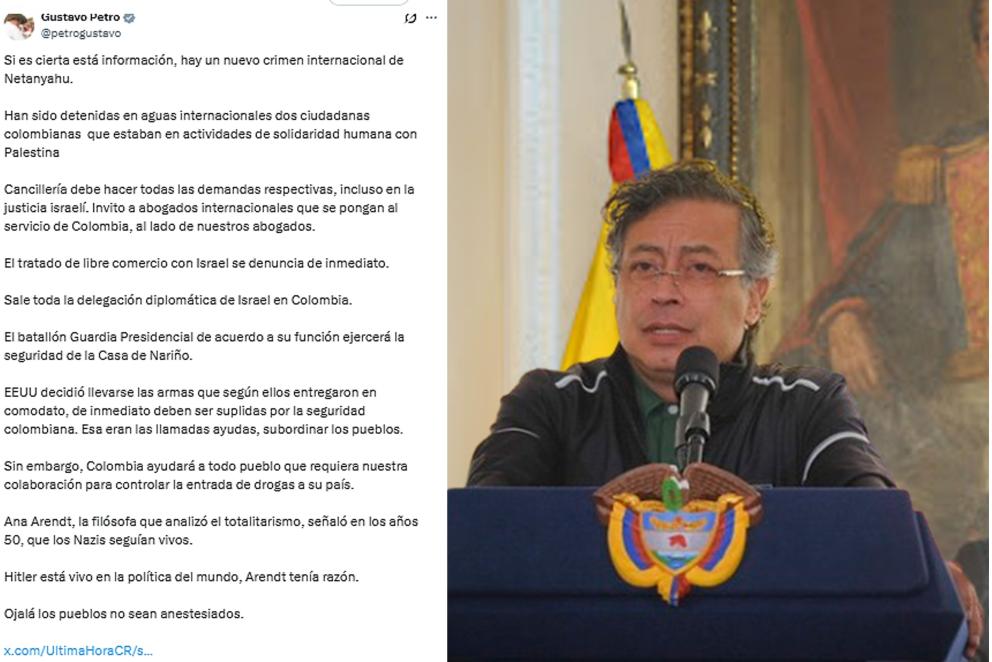 El presidente Gustavo Petro anunció la expulsión de toda la delegación diplomática de Israel en Colombia tras la detención de dos ciudadanas colombianas en aguas internacionales durante una misión humanitaria con Palestina, generando tensión y medidas leg